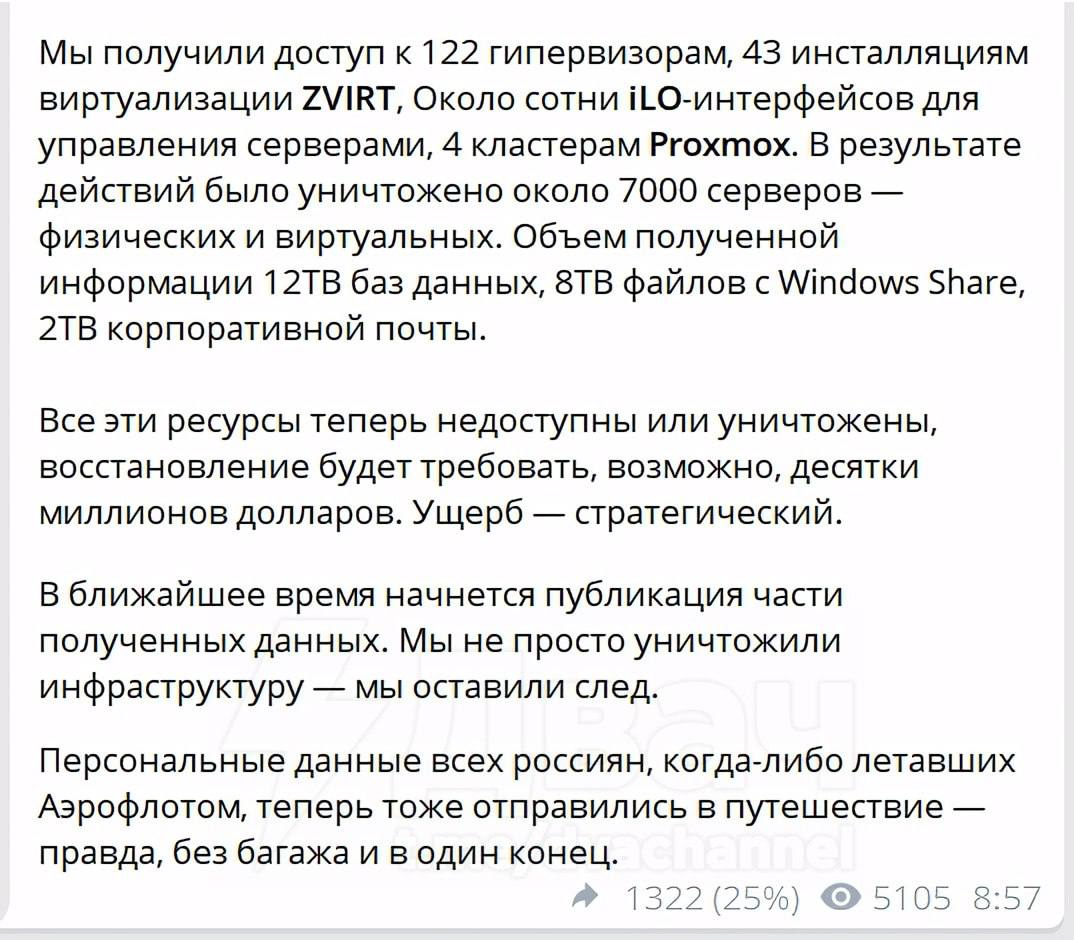 По их заявлениям, операция длилась около года и завершилась якобы полным уничтожением внутренней ИТ-инфраструктуры авиакомпании. По их данным, уничтожено порядка 7000 физических и виртуальных серверов, получено более 20 Тб данных.