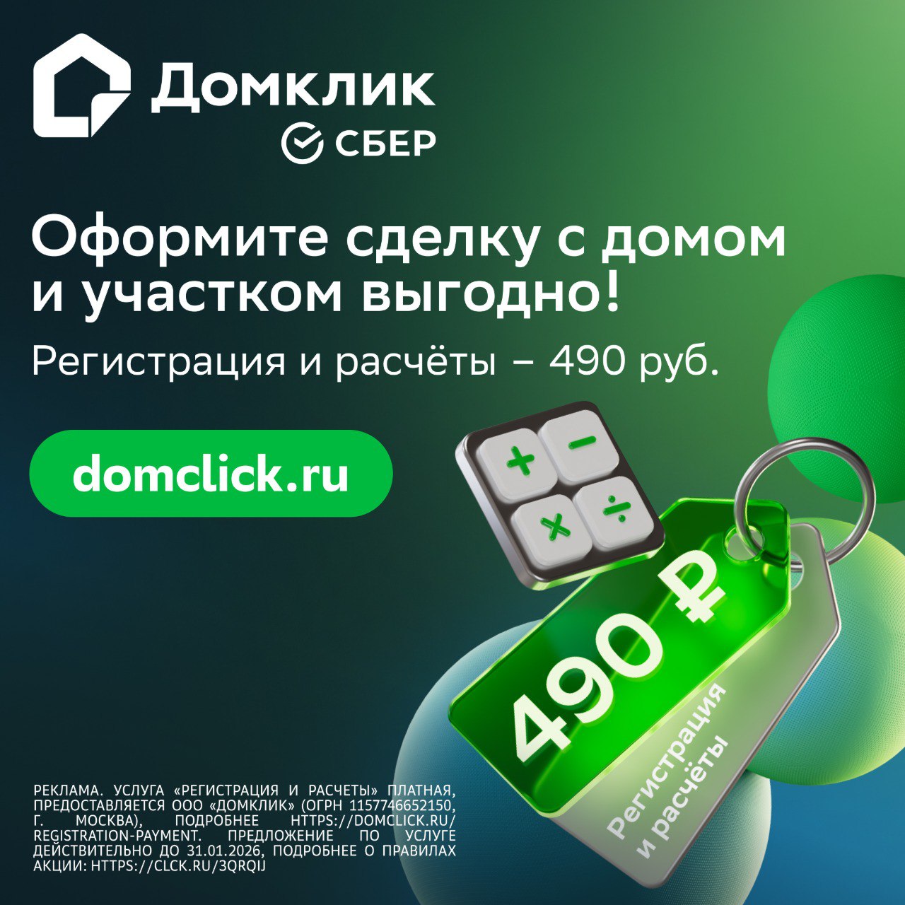 Только до 31 января 2026 стоимость услуги «Регистрация и расчёты (https://my.domclick.ru/easy-deal?utm_source=telegram&utm_medium=display&utm_campaign=easy-deal_digital_media_RF_2025&utm_content=seed&utm_term=federation_igs&erid=2Vtzqw2AuQW)» при покупке участка или дома с участком — от 490 рублей. Акция действует по всей России.